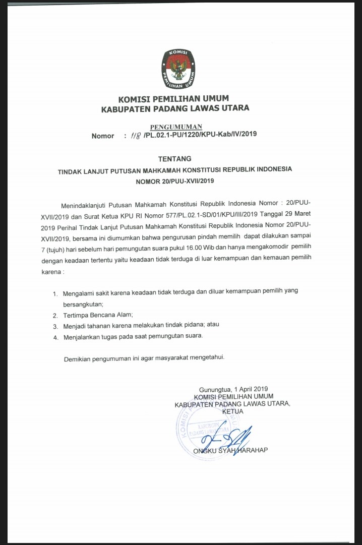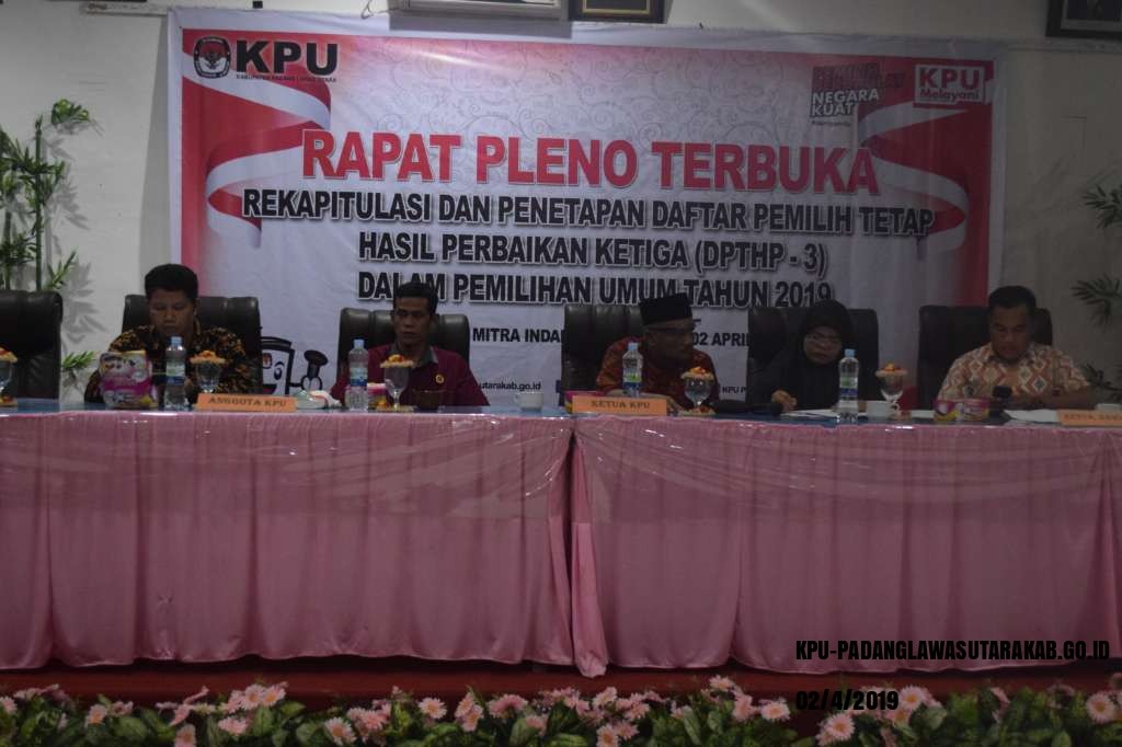 2 April 2019, Selasa jam 21.00 Wib KPU Padang Lawas Utara menggelar Rapat Pleno Terbukan DPTHP-3 di Hotel Mitra Gunung Tua. Dalam acara itu dihadiri Bawaslu Kabupaten Padang Lawas Utara, Partai Politik dan juga PPK dari 12 Kecamatan di Kabupaten Padang Lawas Utara