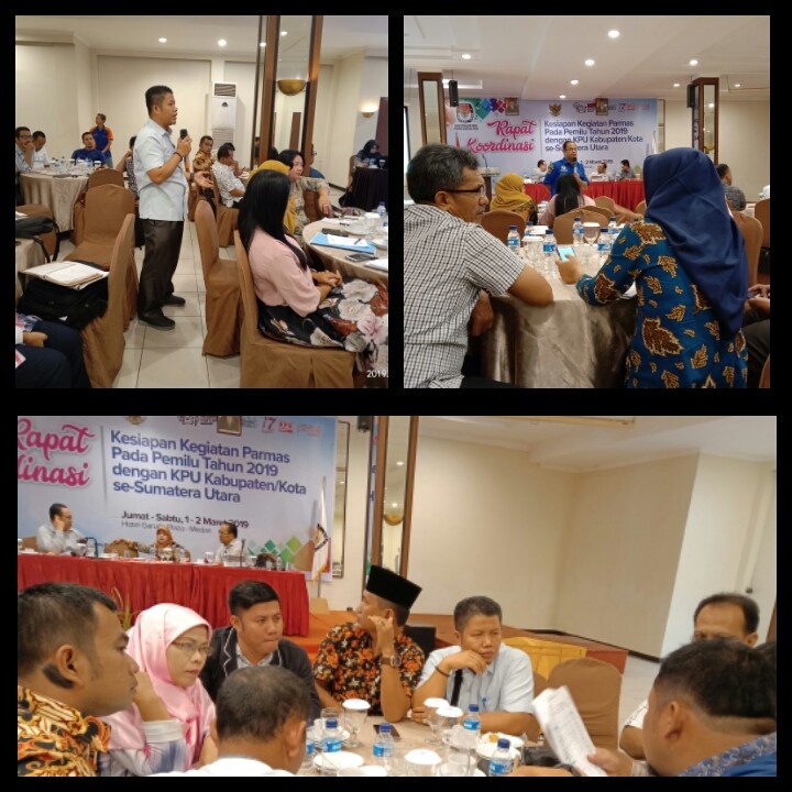 Jumat, 1 Maret KPU Padang Lawas Utara divisi Parmas dan SDM mengikuti Rapat Koordinasi Kesiapan Kegiatan Parmas pada pemilu tahun 2019 dengan KPU Kabupaten / Kota se-Sumatera Utara Jumat-Sabtu di Hotel Garuda Plaza Medan. Kegiatan ini dilaksanakan selama 2 hari tanggal 1-2 Maret 2019. Kordiv Parmas KPU Sumut mengatakan ,'' Kawan-kawan Relasi jangan lagi membuat kegiatan sosialisasi basis didaerah yang sudah ada kegiatan sosialisasi sebelumnya. Sosialisasi itu harus menyeluruh. Jadi, kawan-kawan relasi harus memetakan daerah mana yang sudah dan belum ada sosialisasi'' ujar beliau. Bapak Nafsir Rambe selaku koordinator divisi sosialisasi dan Parmas mengatakan,'' Yang menjadi point penting bagi kawan-kawan relasi adalah bagaimana sosialisasi tidak massif dan metode sosialisasi. Untuk itu Relasi harus mengevaluasi setiap kegiatan yang dilaksanakan , survei membuktikan yang terdaftar dalam DPT dibawah 50 persen yang tahu 17 April adalah Pemilu Serentak,'' ujar beliau.
