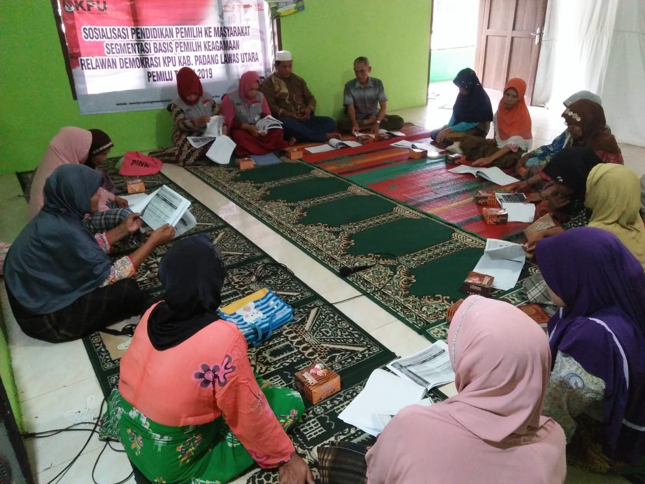 JUMAT, 15 Februari 2019 diadakan sosialisasi pendidikan pemilih ke masyarakat segmentasi basis pemilih keagamaan relawan demokrasi KPU Kab. Padang Lawas Utara Pemilu Tahun 2019. Tujuan diselenggarakan sosialisasi relawan demokrasi ini adalah untuk berkolaborasi dengan kelompok keagamaan agar dapat menggunakan forum keagamaan sebagai sarana sosialisasi dan pendidikan pemilih. Mengenalkan bagaimana tata acara pemilu 2019. Diharapkan dengan adanya kegiatan ini pemilih bisa lebih cerdas menggunakan hak pilihnya untuk memilih pemimpin yang membangun dan memperhatikan kesejahteraan rakyat daerah.
