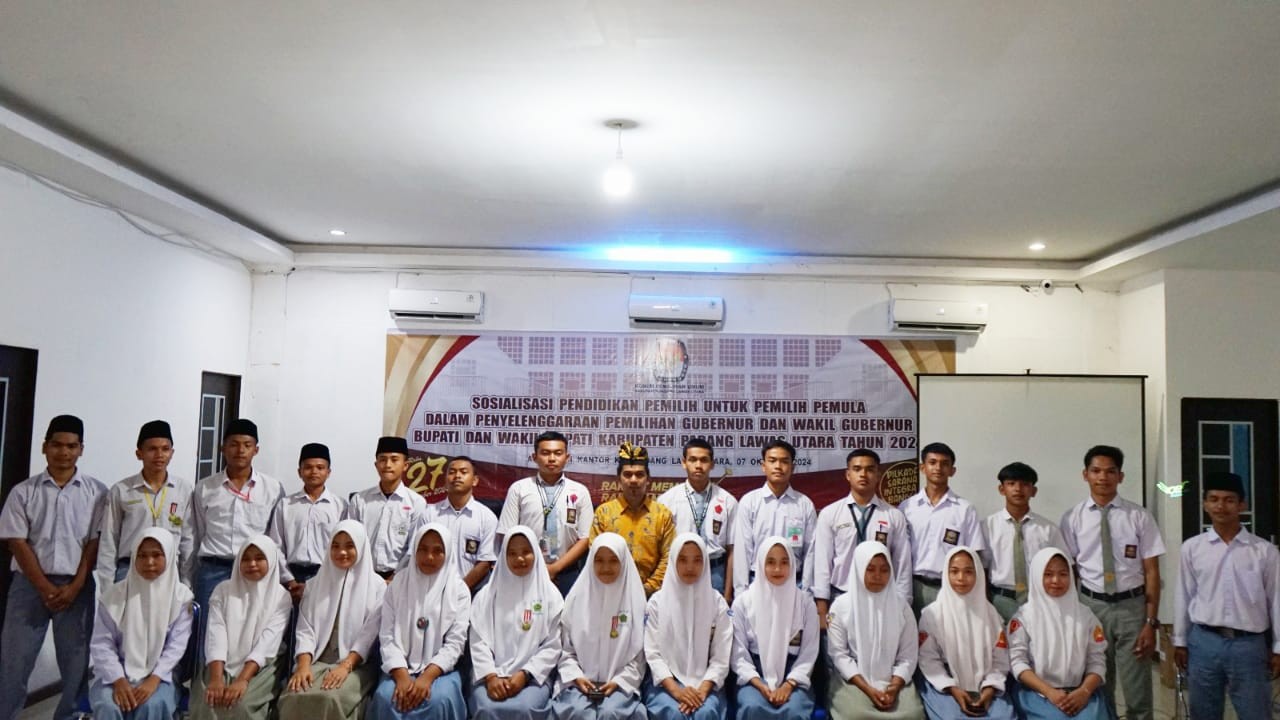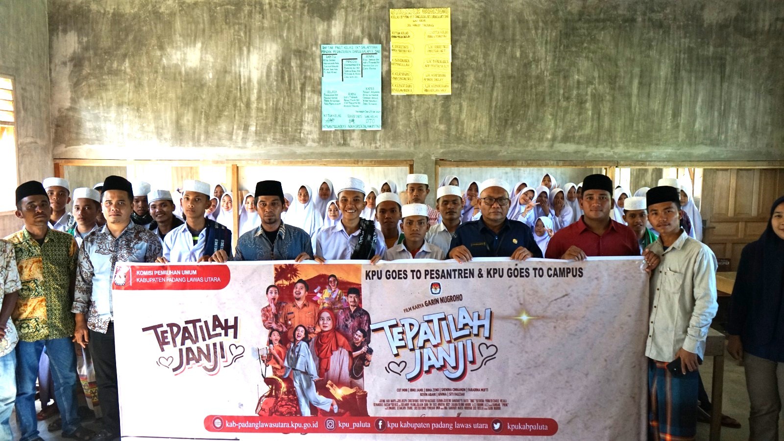 Gunungtua - Dalam rangka peringatan Hari Santri Nasional KPU Padang Lawas Utara gelar nonton bareng Film Pemilu "Tepatilah Janji" bersama santri dan santriwati Pondok Pesantren Darussalam Siunggam Jae di Kecamatan Padang Bolak Tenggara, Padang Lawas Utara. Selasa (22/10). Kegiatan ini merupakan program KPU RI "Goes To Pesantren" dalam memperingati Hari Santri 22 Oktober 2024 dan bagian dari upaya meningkatkan partisipasi pemilih pemula melalui Nonton Bareng film "Tepatilah Janji". Anggota KPU Kabupaten Padang Lawas Utara, selaku Ketua Divisi Sosisalisasi Pendidikan Pemilih, Partisipasi Masyarakat, dan SDM Parulian Siregar mengatakan melalui film ini terdapat makna dan hal positif yang dapat diambil agar mendorong partisipasi masyarakat aktif pada Pilkada, Rabu 27 november 2024 mendatang. Adapun agar menarik kegiatan ini, juga diadakan sesi tanya jawab bagi yang beruntung akan mendapatkan bingkisan menarik dari KPU kepada para santri dan santriwati. Hadir juga pada kegiatan tersebut Pimpinan Ponpes Darussalam Siunggam Jae, Kasubbag SDM dan Parmas, Septo Indra Sakti S, staf sekretariat KPU Padang Lawas Utara dan seluruh santri dan santriwati Pondok Pesantren Darussalam Siunggam Jae. (Sandy – KPU Kabupaten Padang Lawas Utara)