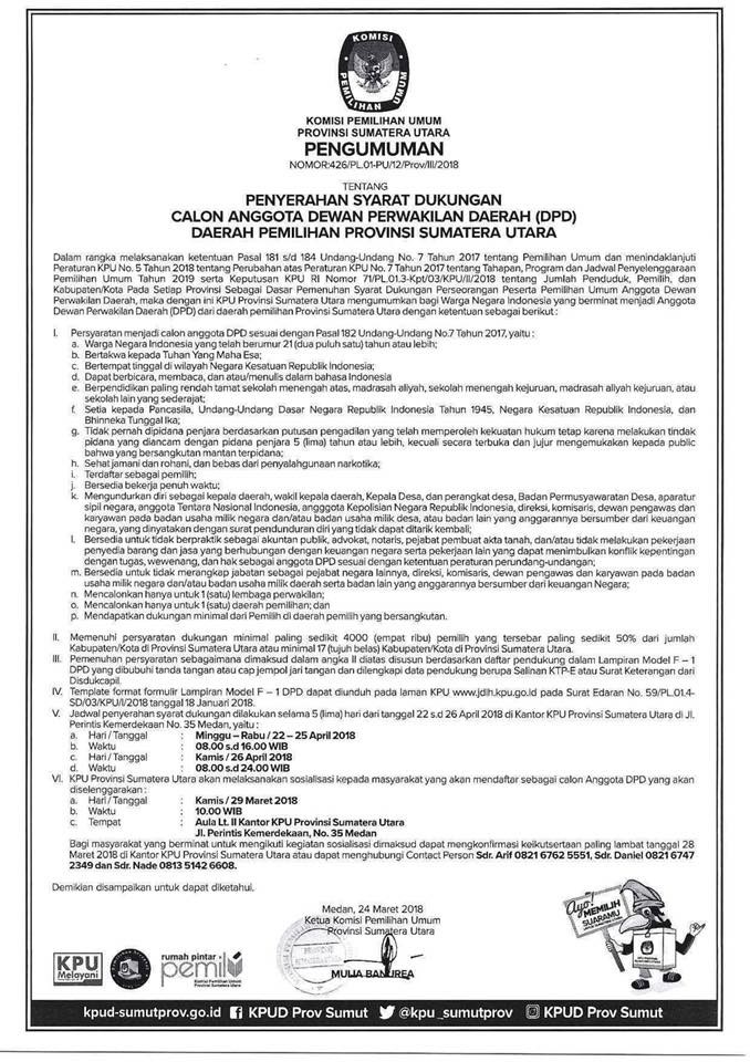 Masih kata Herisal, setiap pimpinan partai politik yang akan mendaftarkan ke KPU di semua tingkatannya mesti sudah siap dengan syarat-syarat yang telah ditentukan diantaranya memiliki kantor tetap, keterwakilan 30% perempuan, memiliki kepengurusan sesuai yang telah di tentukan oleh peraturan perundang-undangan serta sarat-sarat lainnya, selain itu partai politik juga menunjuk dan menetapkan dua orang penghubung, yang nantinya berkoordinasi dengan KPU Kabupaten/Kota untuk mempermudah akses informasi dan melakukan pendaftaran, imbuhnya.