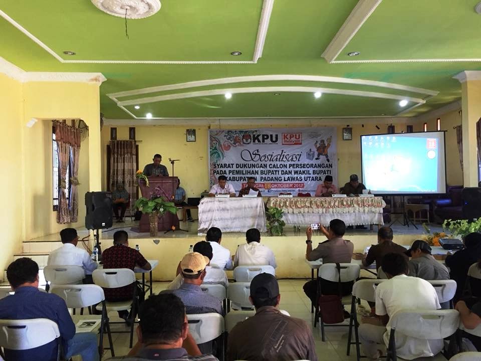 Komisi Pemilihan Umum Kabupaten Padang Lawas Utara (KPU Paluta) menggelar sosialisasi dan bimbingan teknis (bimtek) tata cara pendaftaran, verifikasi, partai politik calon peserta pemilu tahun 2019, di Aula Lobubara,Desa Purba Sinomba, Kecamatan Padang Bolak, Senin (2/10/2017).