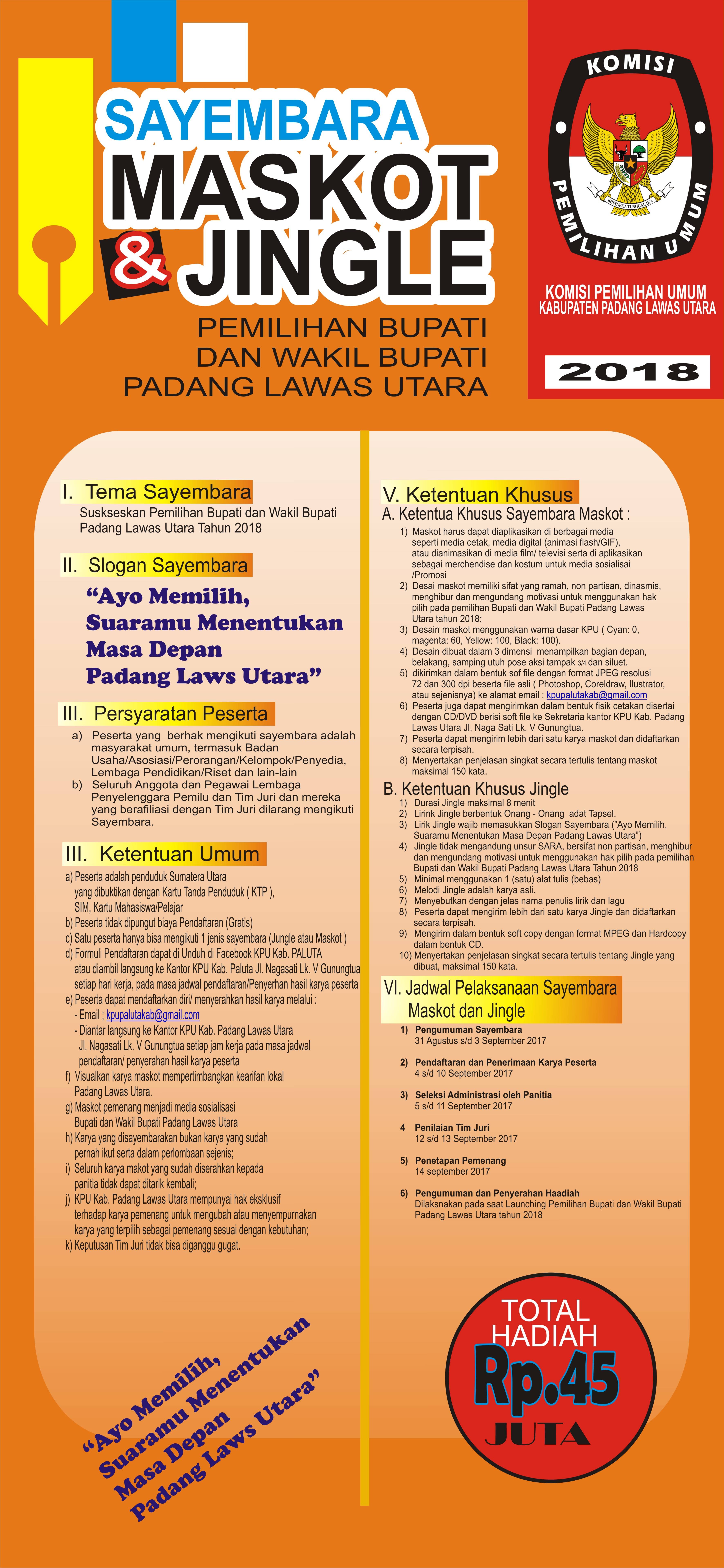Jingle tidak mengandung unsur SARA, bersifat non partisan, menghibur, dan mengundang motivasi untuk menggunakan hak pilih pada Pemilihan Bupati dan Wakil Bupati Padang Lawas Utara Tahun 2018. Minimal menggunakan 1 (satu) alat musik (bebas), melodi Jingle adalah karya asli, menyebutkan dengan jelas nama penulis lirik dan lagu .