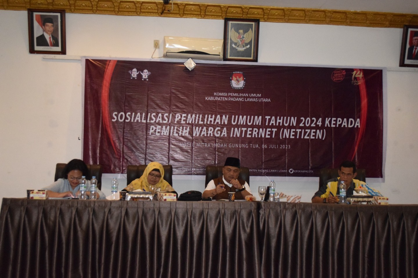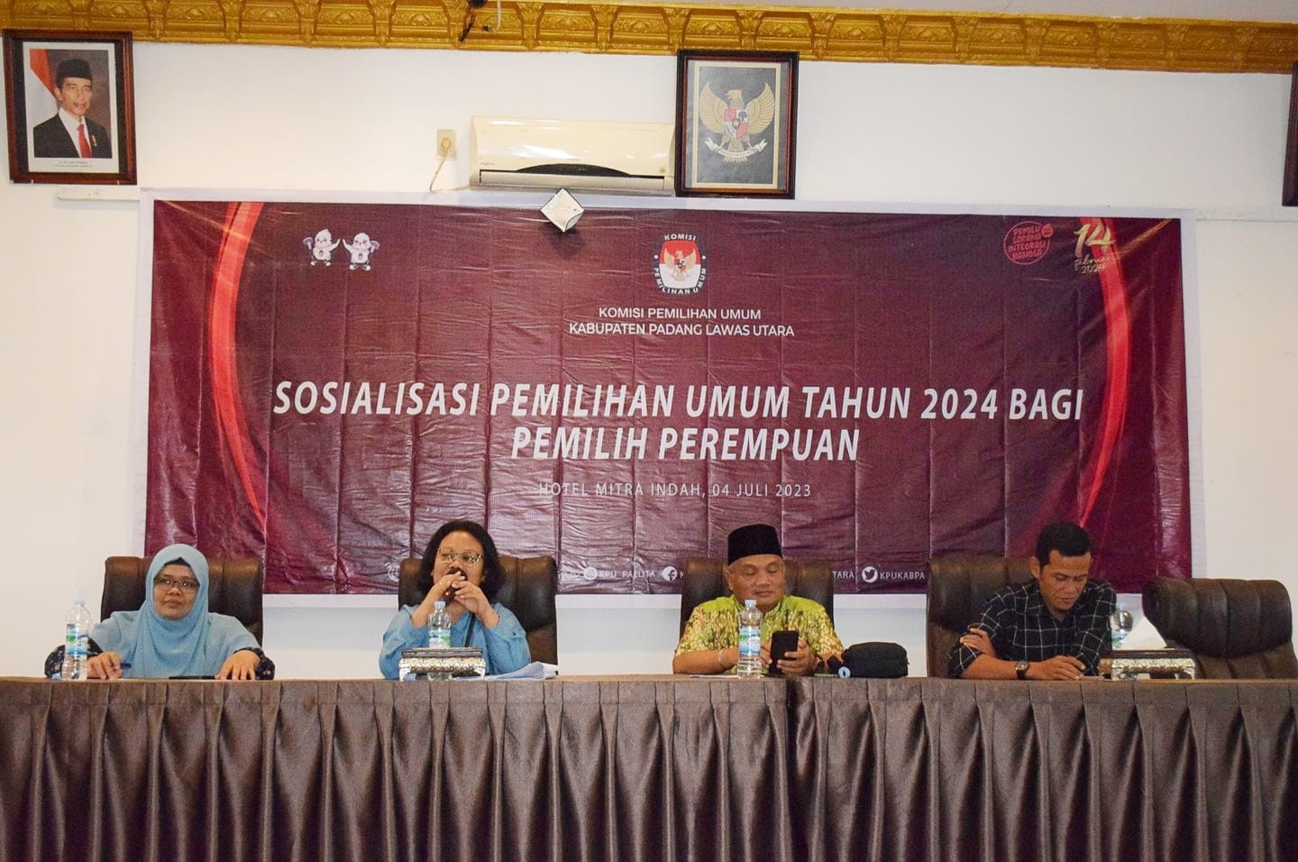 Gunungtua - Komisi Pemilihan Umum Kabupaten Padang Lawas Utara melaksanakan Sosialisasi Pemilihan Umum Tahun 2024 dengan segmen basis Pemilih Perempuan yang dilaksanakan di Hotel Mitra Indah Gunungtua, Selasa (04/07/2023). Adapun peserta sosialisasi tersebut adalah kaum perempuan, baik dari masyarakat umum, organisasi masyarakat, dan kelompok ibu-ibu Pembinaan Kesejahteraan Keluarga (PKK) di wilayah Padang Lawas Utara. Acara dibuka oleh Ketua KPU Kabupaten Padang Lawas Utara Ongku Syah Harahap didampingi Anggota KPU Lidiyawati Harahap, Yusran Harahap dan Kepala Sub Bagian Teknis dan Partisipasi Hubungan Masyarakat Pargadiapari Harahap. Kegiatan sosialisasi tersebut berjalan dengan metode pemaparan materi secara panel yang disampaikan oleh Ketua KPU Kabupaten Padang Lawas Utara Ongku Syah Harahap dan angota KPU Lidiyawati Harahap serta Yusran Harahap. Adapun KPU Kabupaten Padang Lawas Utara turut mengundang narasumber dari Kejaksaan Negeri Padang Lawas Utara yang diwakili oleh Verawaty Manalu. Beliau lebih menjelaskan tentang Aspek Pidana politik uang dalam Pelaksanaan Pemilu Serentak 2024. Tujuan yang diharapkan dari Kegiatan tersebut adalah meningkatkan partisipisasi masyarakat, khususnya kaum perempuan dalam menggunakan hak pilihnya pada Pemilu Serentak Tahun 2024.