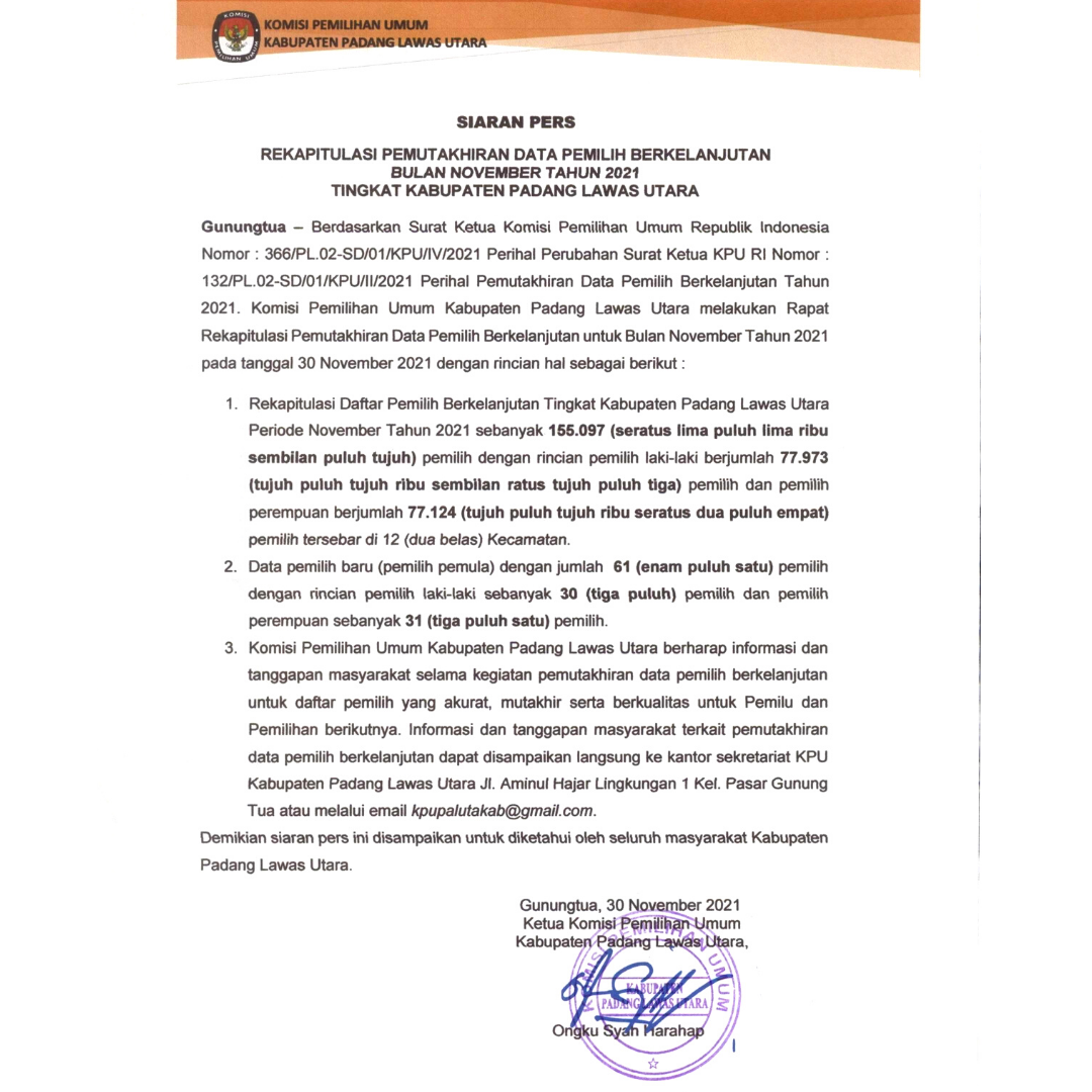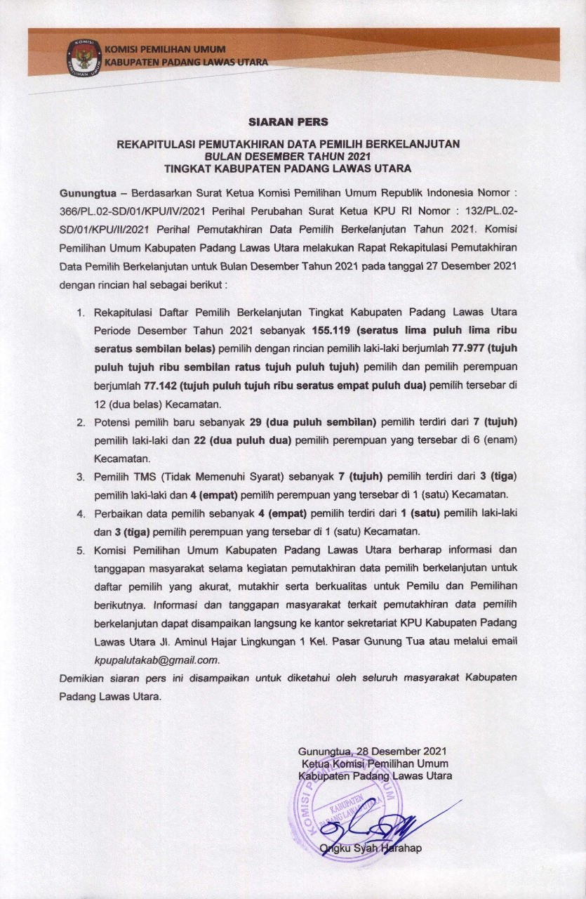 Gunungtua, (27/12). Rapat koordinasi (Rakor) rekapitulasi daftar pemilih berkelanjutan Triwulan IV Tahun 2021 yang dilaksanakan oleh KPU Kabupaten Padang Lawas Utara berjalan lancar. Rakor ini dilaksanakan di ruang rapat kantor KPU Kabupaten Padang Lawas Utara pada Selasa (27/12) pukul 14.00 WIB dan diikuti oleh beberapa pemangku kepentingan terkait secara daring melalui aplikasi zoom meeting. Adapun pemangku kepentingan yang hadir pada rakor ini adalah Kodim 0212/TS yang diwakili oleh Danramil 05, Bawaslu Kab. Padang Lawas Utara. Pada rakor Triwulan IV ini KPU Kab. Padang Lawas Utara melakukan rekapitulasi terhadap pemutakhiran daftar pemilih berkelanjutan mulai dari Bulan Oktober, November dan Desember Tahun 2021, seperti pemutakhiran pada data pemilih yang TMS (Tidak Memenuhi Syarat), perbaikan data pemilih hingga potensi pemilih baru. Selanjutnya, Ketua Kordiv Prodatin Lidiyawati Harahap membacakan Berita Acara Rapat Koordinasi yang menghasilkan data sebagai berikut, Rekapitulasi Daftar Pemilih Berkelanjutan Triwulan IV Tahun 2021 sebanyak 155.119 (seratus lima puluh lima ribu seratus sembilan belas) pemilih dengan rincian 77.142 pemilih perempuan dan 77.977 pemilih laki-laki. Potensi pemilih baru 91 pemilih, pemilih TMS (tidak memenuhi syarat) 18 pemilih dan perbaikan data pemilih sebanyak 208 pemilih. Berita Acara pelaksanaan Rapat Koordinasi DPB Triwulan IV silahkan klik pada link berikut : BA TW IV