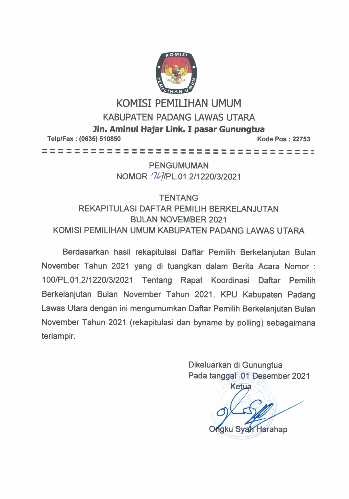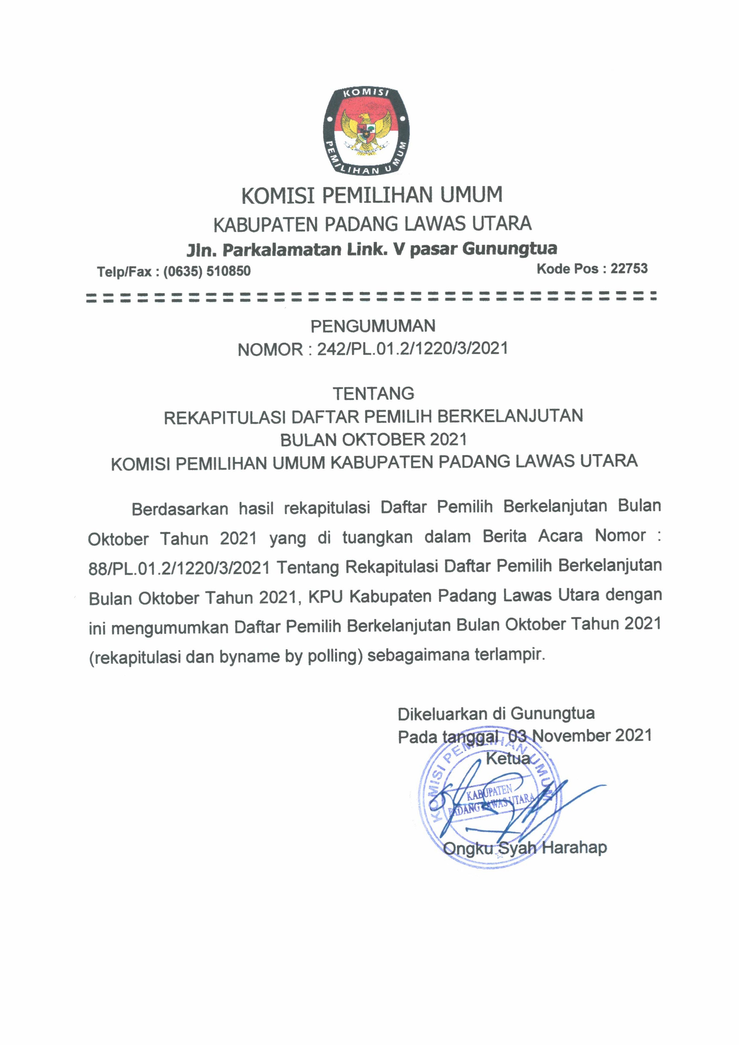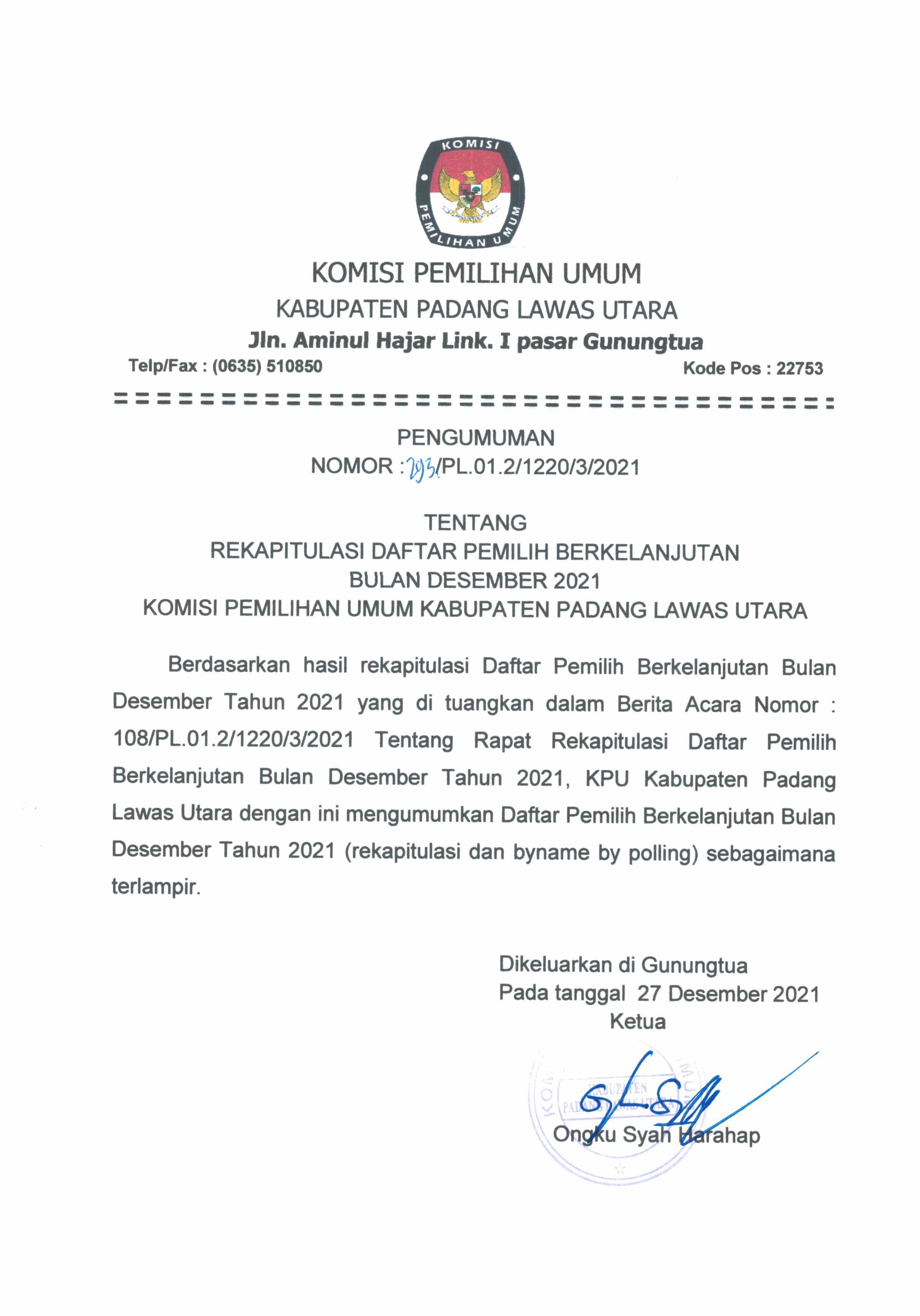 Pelaksanaan Rekapitulasi Data Pemilih Berkelanjutan Tahun 2021 Periode AgustusTahun 2021. Adapun Hasil Rekapitulasi dapat dilihat pada link berikut: