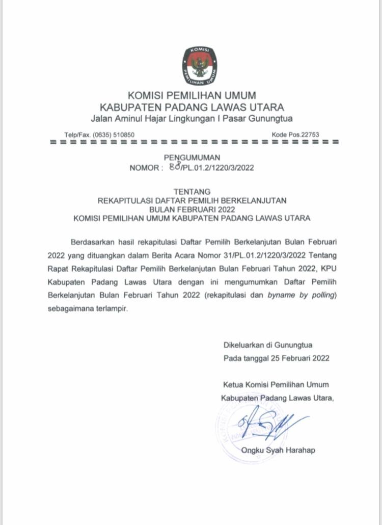 Pelaksanaan Rekapitulasi Data Pemilih Berkelanjutan Tahun 2022 Periode Februari. Adapun Hasil Rekapitulasi dapat dilihat pada link berikut: