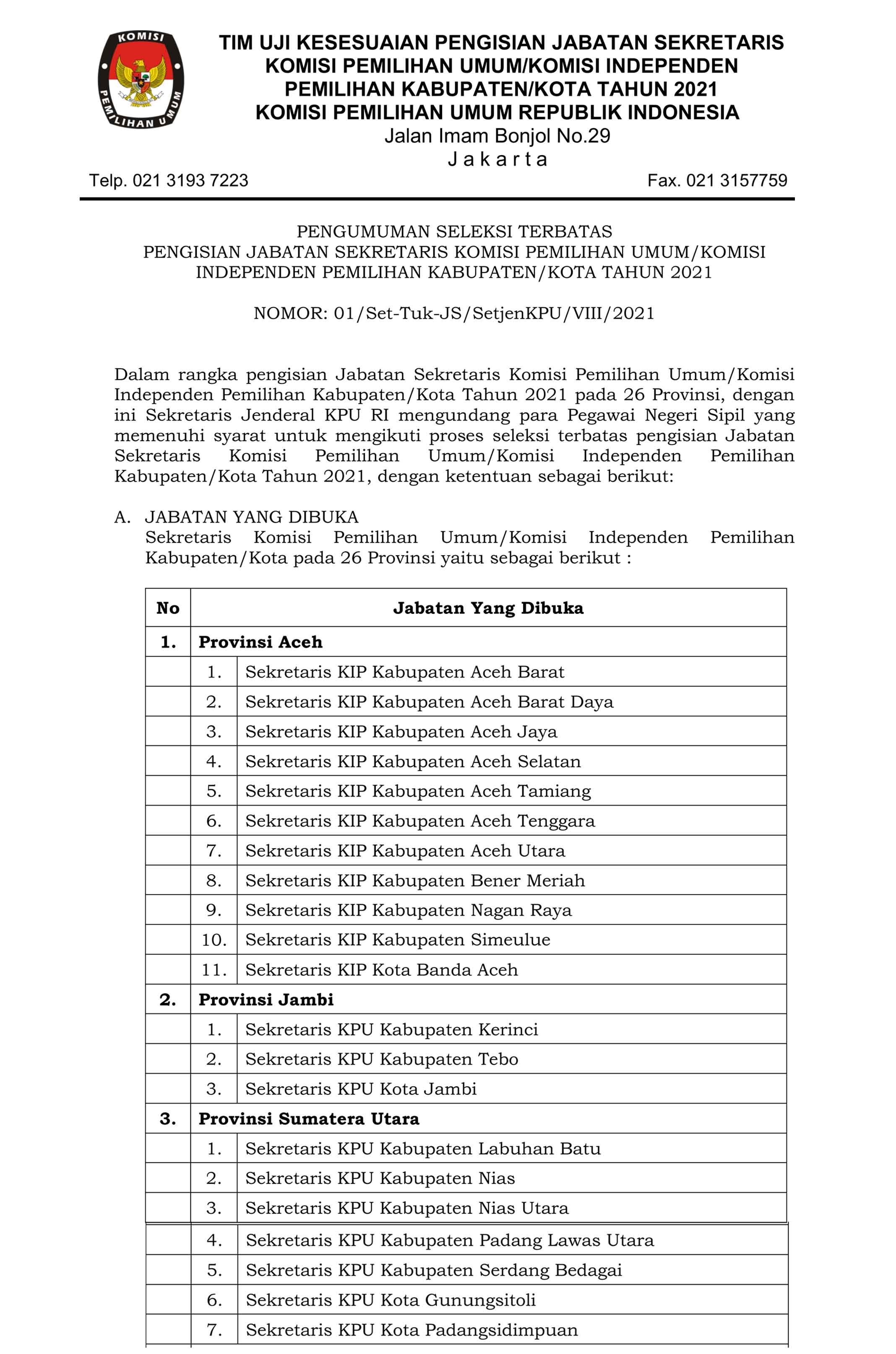 Dalam rangka pengisian Jabatan Sekretaris Komisi Pemilihan Umum/Komisi Independen Pemilihan Kabupaten/Kota Tahun 2021 pada 26 Provinsi, dengan ini Sekretaris Jenderal KPU RI mengundang para Pegawai Negeri Sipil yang memenuhi syarat untuk mengikuti proses seleksi terbatas pengisian Jabatan Sekretaris Komisi Pemilihan Umum/Komisi Independen Pemilihan Kabupaten/Kota Tahun 2021.