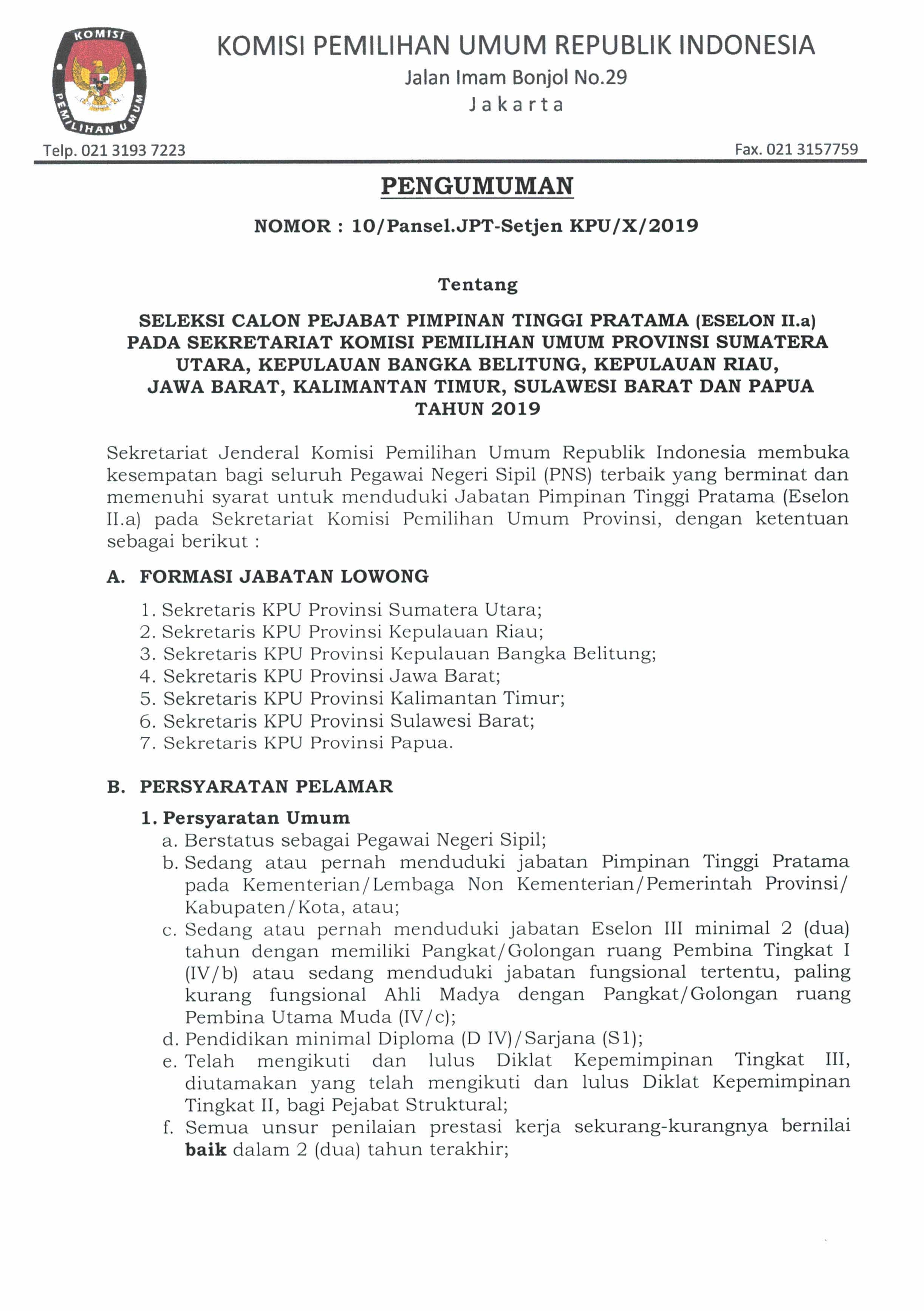 SELEKSI CALON PEJABAT PIMPINAN TINGGI PRATAMA (ESELON II.a) PADA SEKRETARIAT KPU PROV SUMUT, KEP. BANGKA BELITUNG, KEPRI, JABAR, KALTIM, SULBAR, DAN PAPUA TAHUN 2019 Rabu, 16 Oktober 2019 00:00 60 Informasi lengkapnya silahkan klik disini Baca Selengkapnya