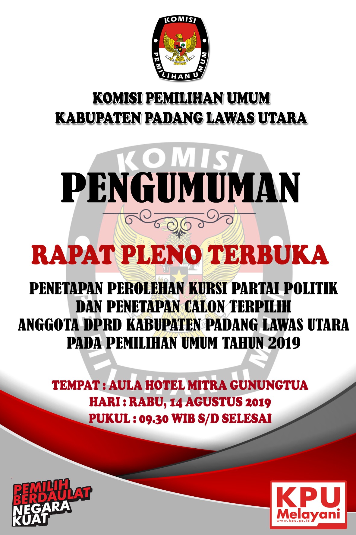 Pengumuman Daftar Calon Terpilih Anggota DPRD Kabupaten Padang Lawas Utara Pemilihan Umum Tahun 2019 Rabu, 14 Agustus 2019 00:00 71 klik disini Baca Selengkapnya