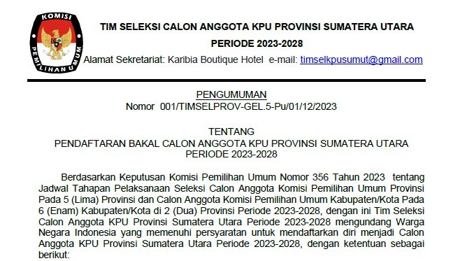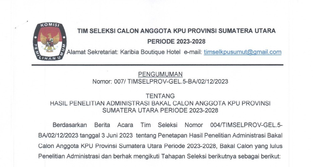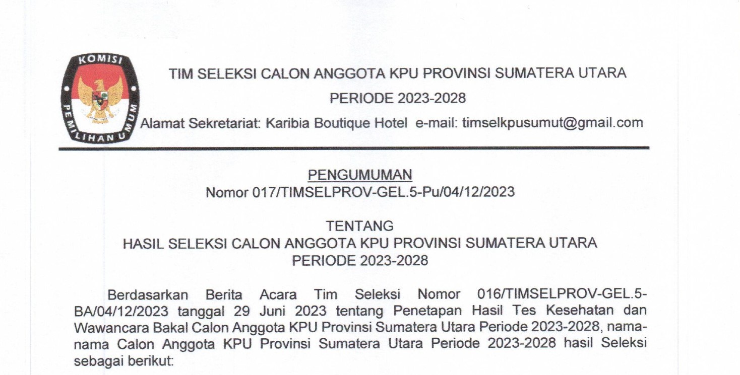 Berikut disampaikan Pengumuman tentang Hasil Penelitian Administrasi Bakal Calon Anggota KPU Provinsi Sumatera Utara Periode 2023-2028