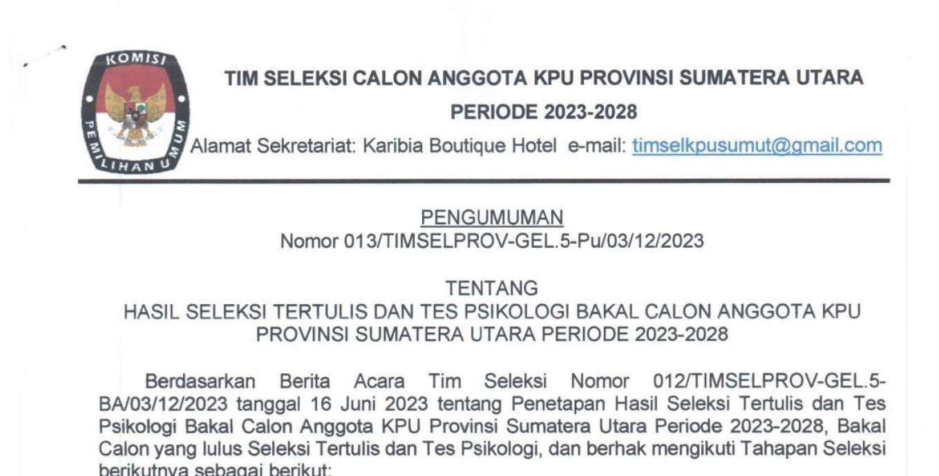 Berikut disampaikan Pengumuman Hasil Seleksi Tertulis dan Tes Psikologi Calon Anggota KPU Provinsi Sumatera Utara Periode 2023-2028.